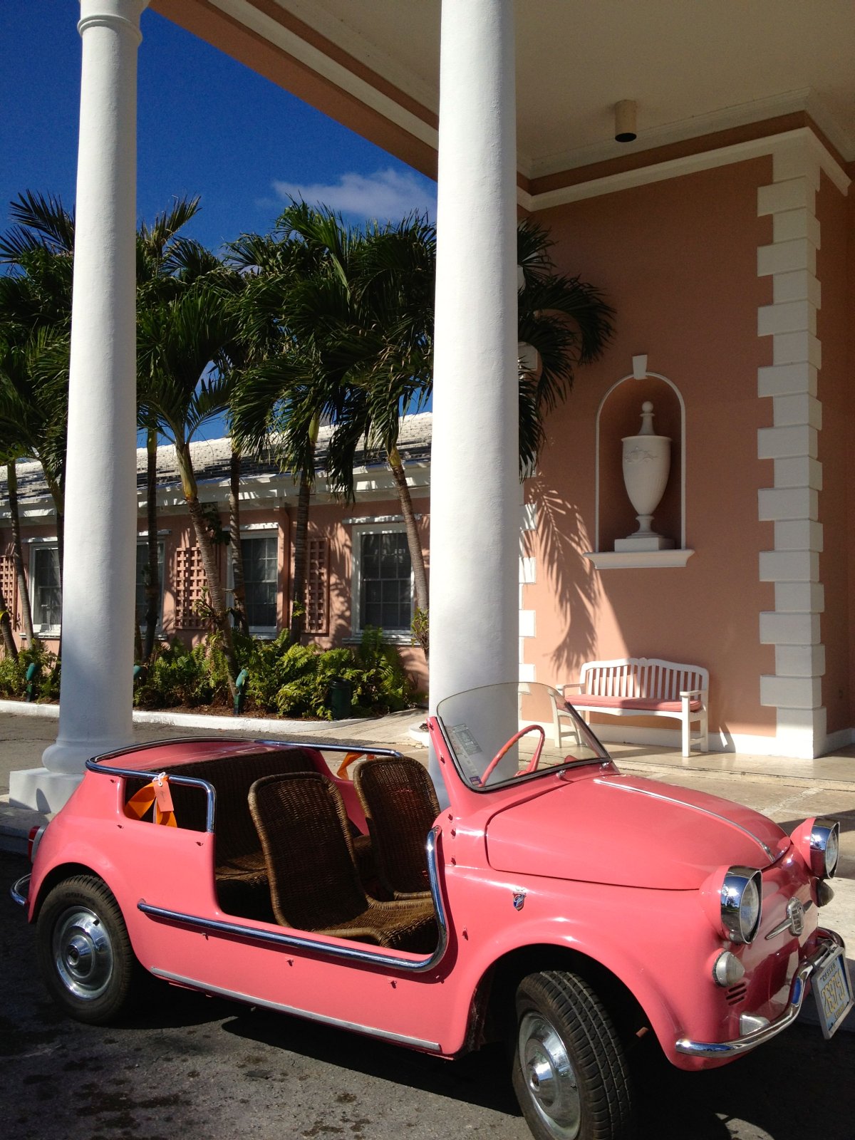 Pink convertible with wicker seats parked in front of Lyford Cay Club, Nassau