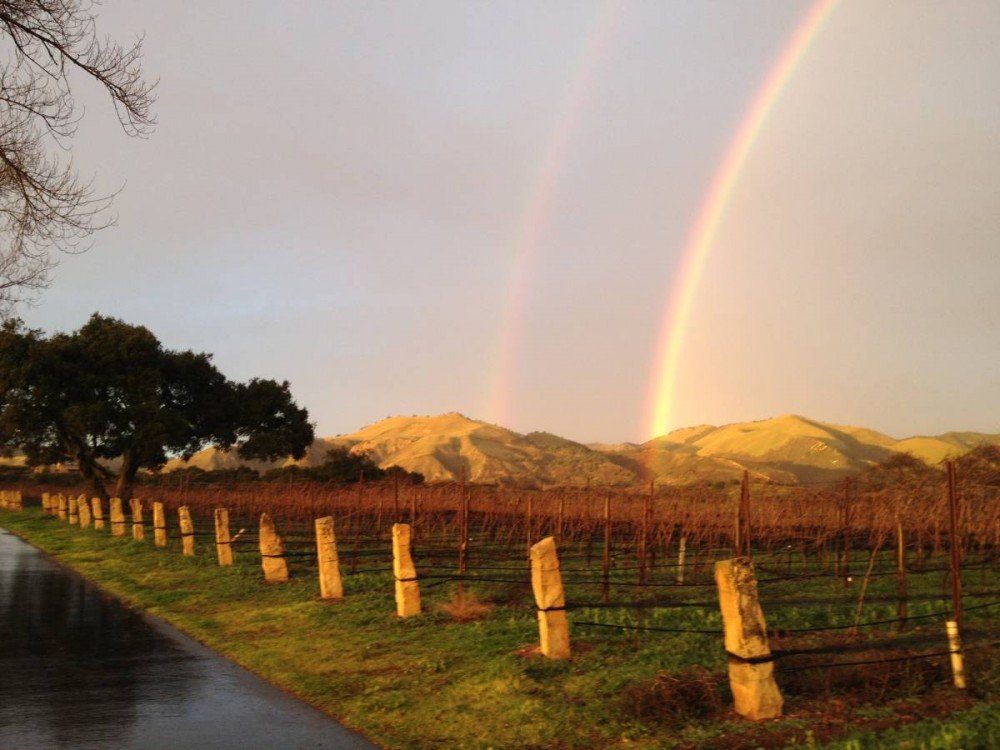 We don’t get that much rain in the Sant Ynez Valley, so when we do it’s great. Everything turns green and stays that way for a while, generally between December and March. Some days when the showers taper off in late afternoon and the sun’s rays slant across the hills, it’s like they’re shining through honey. When the light is magical like that you know there’s a rainbow about to happen somewhere. Maybe even two.
