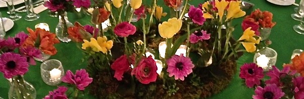 Anyway F1 does many things well, entertaining being one of them. For this lively gathering of 12 she moved a sectional sofa from the living room into the dining room, where it magically looks as if it was meant to be there. In its place is a 90-inch round table divinely swathed in St. Patrick’s Day green and planted with tulips, poppies, ranunculas, and freesia.