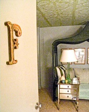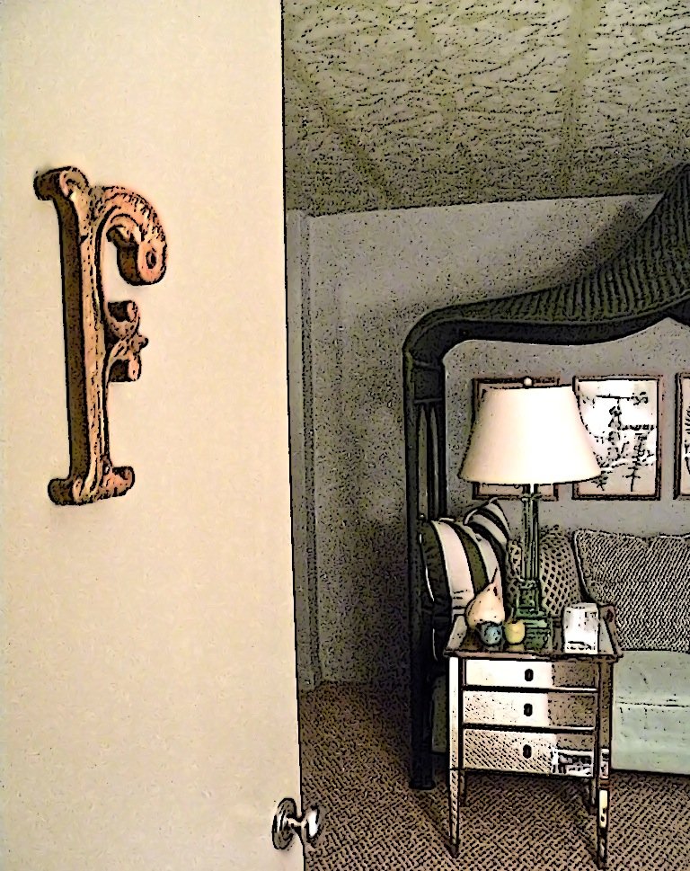 NY Office Door With Toon Camera. The Tony Duquette wicker daybed will move with me, as will the mirrored side table with all its broken bits. The "F" - for Fabulous - I found at the Paris flea market. That sisal carpet will move on to the great re-cycling bin in the sky.
