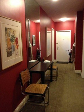 I am also going to miss our snazzy red communal hallway. My neighbors took a leap of faith when they let me paint it red, but I think they liked it. Red is a great color for a hall because Mark Hampton said so. This was a good red. Not too orange, not too blue. Benjamin Moore Burnt Peanut Red.