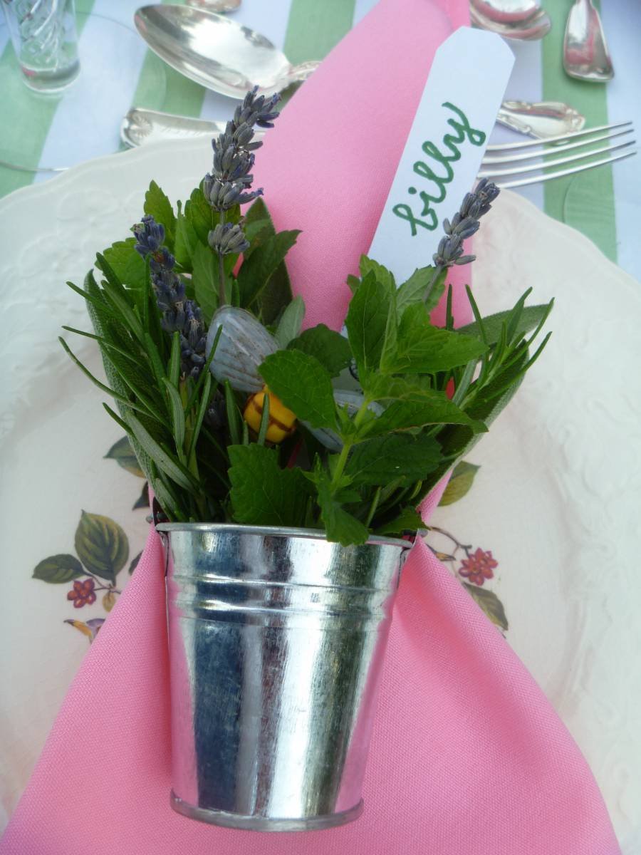 Miniature buckets from the art supply store are filled with herbs and a little bee. (I know, I can't help myself) "Garden markers" cut from cardboard serve as place cards. To preserve the herbs, wrap the stems in a bit of wet paper towel - works like a charm.