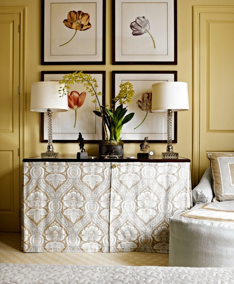 How cute – and thoughtful for guests – that she has her address and telephone number embroidered on her linens. The sconce lighting is also a great choice here.