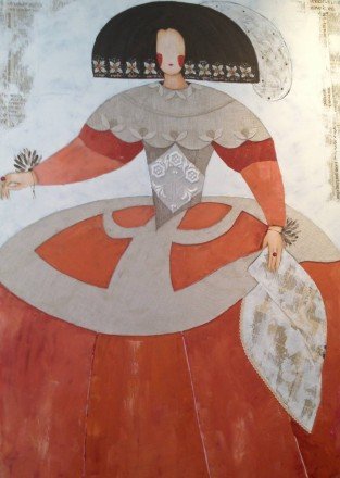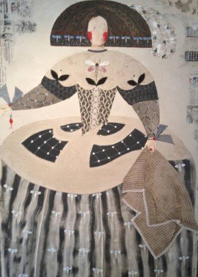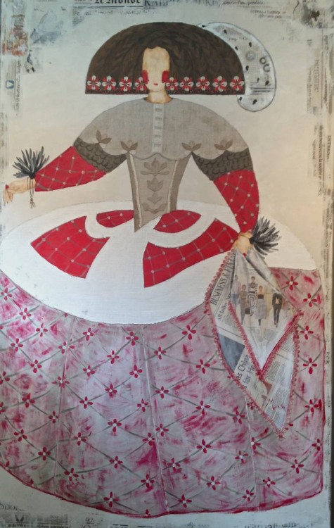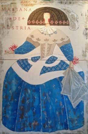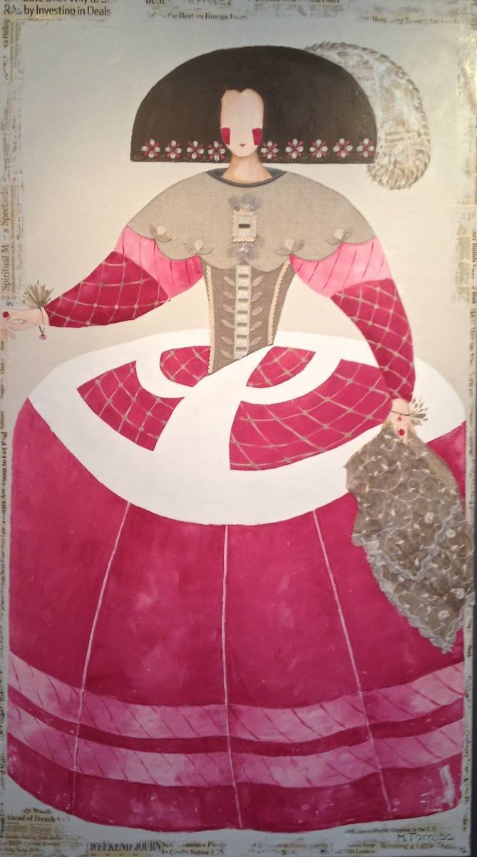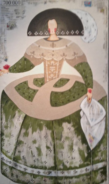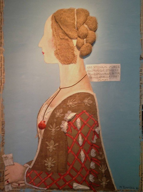 The exhibition was called “Fabricating History,” and the description from Hoppen’s website begins, “Maria Torroba’s compositions are visually enchanting and richly tactile, incorporating the lustre of oil painting with antique fabrics and lace embroidered by the artist’s grandmother. Her inventive take on traditional Renaissance portraiture is both quixotic and ornate, whilst steeped in regal exuberance.”