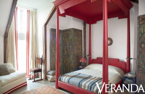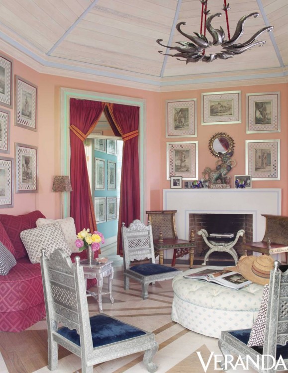 It’s brilliant the way he takes inspiration from something extravagant like a European castle or maharaja’s bedroom and translates it to his own work. (I wrote about that in another Veranda article on Tom in May ’12, posted about here. Btw the May ’12 article was on his other Water Mill house, since sold.)