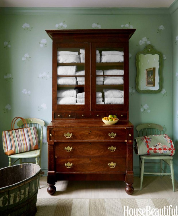 The two rooms upstairs were re-purposed into a bedroom and closet/dressing area. The owner wanted to use childhood furniture that had been painted by her grandfather. Mary Douglas repeated its delicate floral motif on the walls and bed. Aww. Another family piece, a rather imposing mahogany secretary, works beautifully as a linen press. A custom painted cotton rug gives a light, contemporary touch.