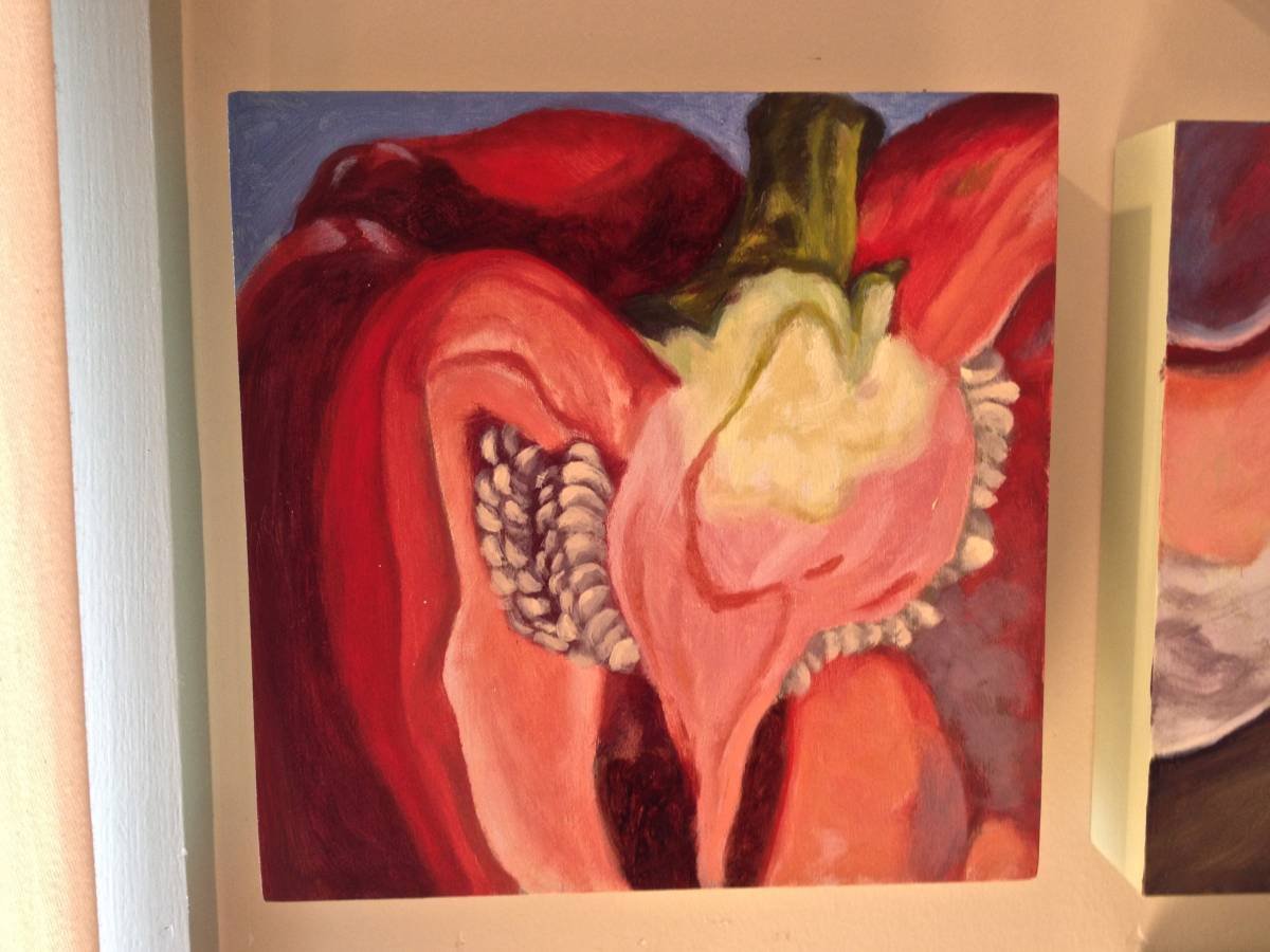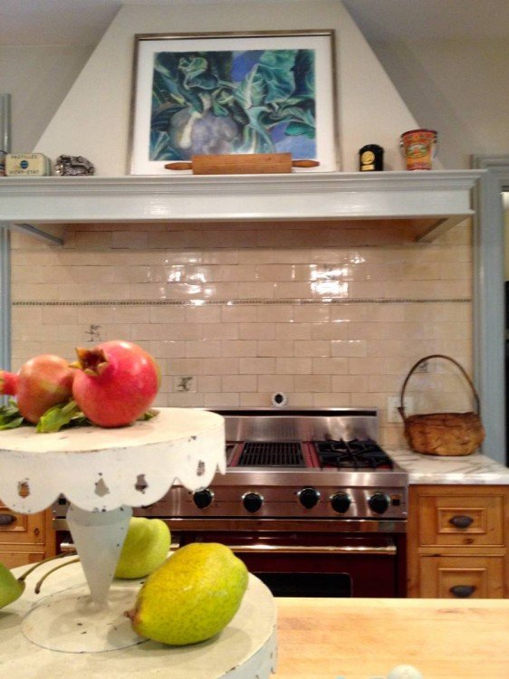 Speirs kitchen, with one of Ginny’s wonderful vegetable paintings propped on the stove’s hood.