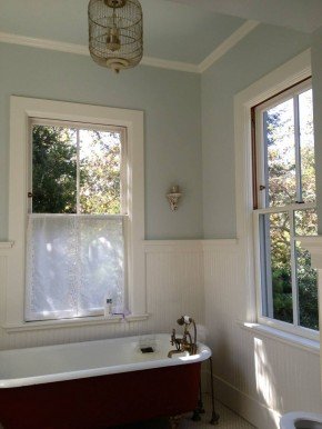 A big bathtub in front of a window is my idea of heaven. The light fixture is a converted birdcage.