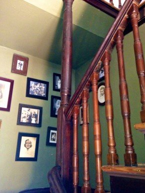 The arrangement of vintage and black and white photos in the stairwell is attractive and interesting. Notice the random placement and how they are hung floor-to-ceiling.