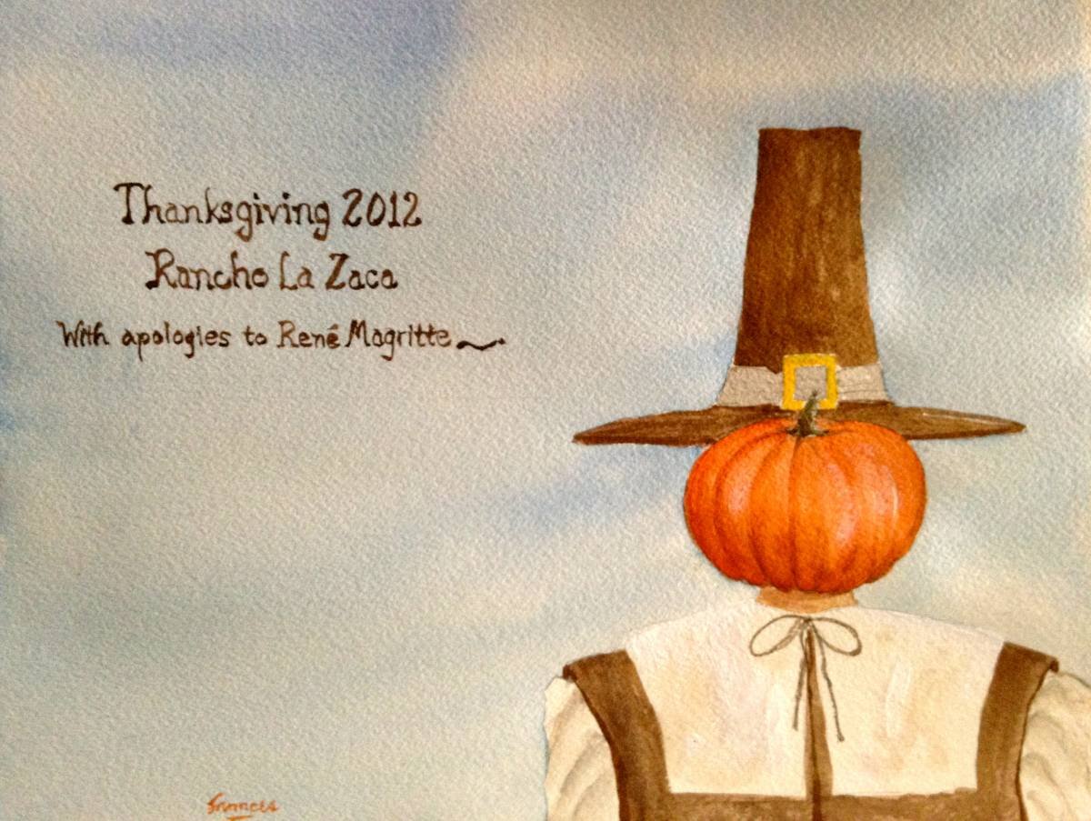 Thanksgiving place cards at Rancho La Zaca – Pumpkin-head Pilgrim in the style of Magritte’s ”Man in the Bowler Hat,” by moi.