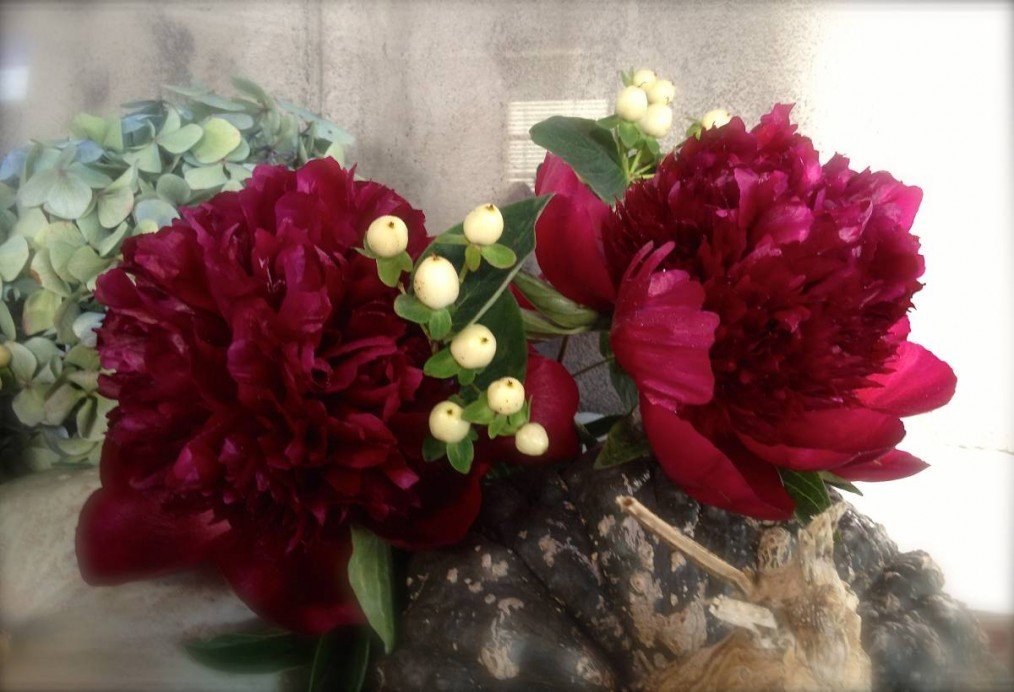 The table is coming together. I used a large shallow basket as my container and placed  drinking glasses filled with flowers among the pumpkins, persimmons, pomegranates and grapes. It looks harder than it was.