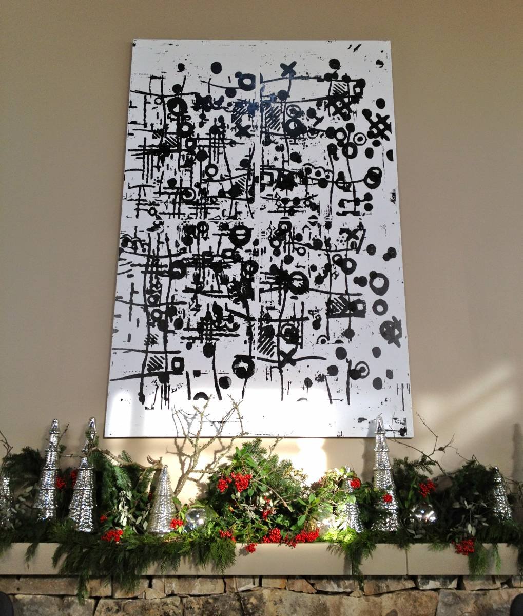 His Grace (my husband for new readers) and I were lucky to have loaned to us for a while this striking Christopher Wool piece, photographed here hovering above the Christmas mantle.